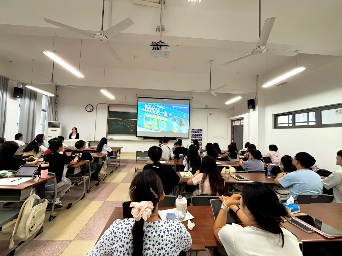 9月16日9:00-12:00,学院分别组织了英语22-2班、24与25级翻译硕士班全体学生集中观看由公安部刑侦局联合央视频开展的2025年秋季学期“大中小学生反诈大讲堂”线上直播,学院关工委成员到场参与并协助做好现场组织引导工作。直播通过典型案例剖析新型诈骗手段,让学生在案例分析中强化警惕意识,直播结束后,同学们均表示对新型诈骗手段有了更清晰的认知,将提高自我保护能力。