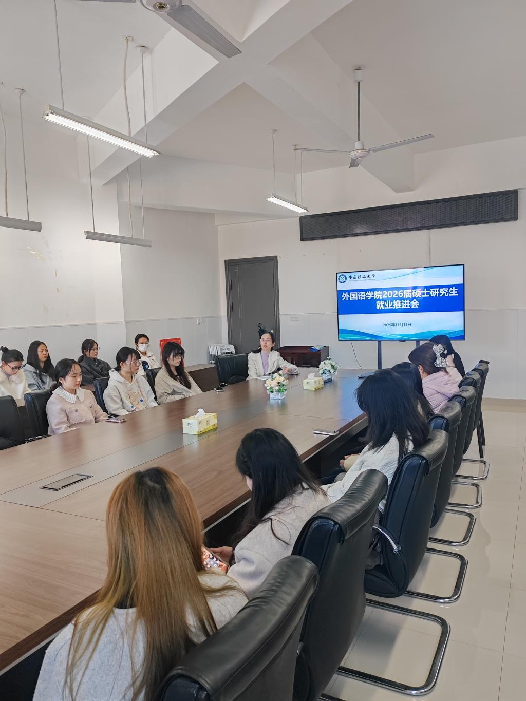 11月11日下午,外国语学院在崇智楼会议室召开2026届毕业研究生就业推进会。会议由学院党委负责人主持,毕业班辅导员以及全体2026届毕业生参加会议。