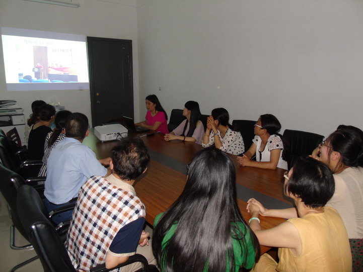 7月5日上午,外国语学院在学院会议室举行访学教师交流汇报会,从南京大学访学回校的学院教师徐芳与10余位同事分享了一年来的访学经验和心得体会。