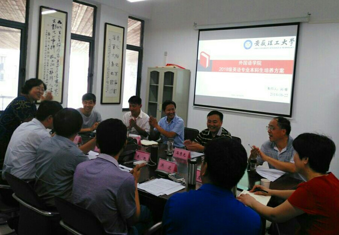 8月23日下午,外国语学院在崇智楼二楼会议室召开2018版本科培养方案论证会。本次会议邀请安徽省外文学会会长、安徽省外国语言文学类专业合作委员会会长、安徽大学外语学院原院长朱跃教授,安徽省外国语言文学类专业合作委员会副会长、安徽师范大学外语学院院长张德让教授,安徽工业大学外语学院院长洪流教授,淮南师范学院外语学院院长张文凤教授分别对英语语言文学和日语语言文学2018版本科专业培养方案进行论证。我校教务处处长黄友锐、外国语学院特聘教授陈纪梁、学院党委书记石秀光等院领导以及各系主任参加了会议。