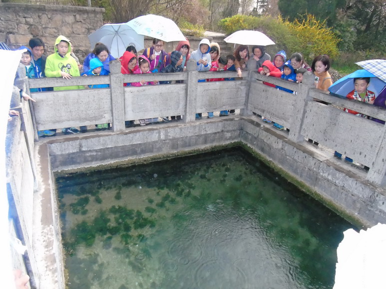 春色正好。大家又前往刘安墓,缅怀先贤,感慨古今。在清澈的珍珠泉边,平日里严肃认真的老师们仿佛又回到了孩童时代,和自己的子女们一同欢叫,看着水底涌出的水泡,欣赏着“咄泉”的奇妙。