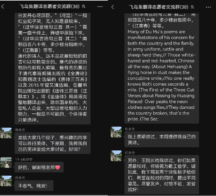 “各位同学,又到了交作业的时候啦!”每到周五下午,老教授便在外国语学院翻译志愿者交流群里提醒大家。2022年初以来,为弘扬中国传统文化,发挥老教授余热,帮助外国语学院培养英语专业本科生、英语笔译硕士生的翻译技巧,外国语学院关工委、团委创建了一支由在校本科生、硕士生组成的翻译志愿者队伍,邀请程永胜教授担任指导老师。老教授每周五都会先发一段古诗词素材留给同学们翻译,然后下一周再将自己的英译材料与群里面学生翻译材料进行比对并讨论交流,极大地提升了同学们对古典文学和中国传统文化翻译的兴趣。“通过线上交流,我们不仅能够与程教授交流翻译的技巧,更是从老教授身上学习到了那种严谨治学、笔耕不缀的人生态度,受益良多。”2019级英语6班韩梦梦如是说。