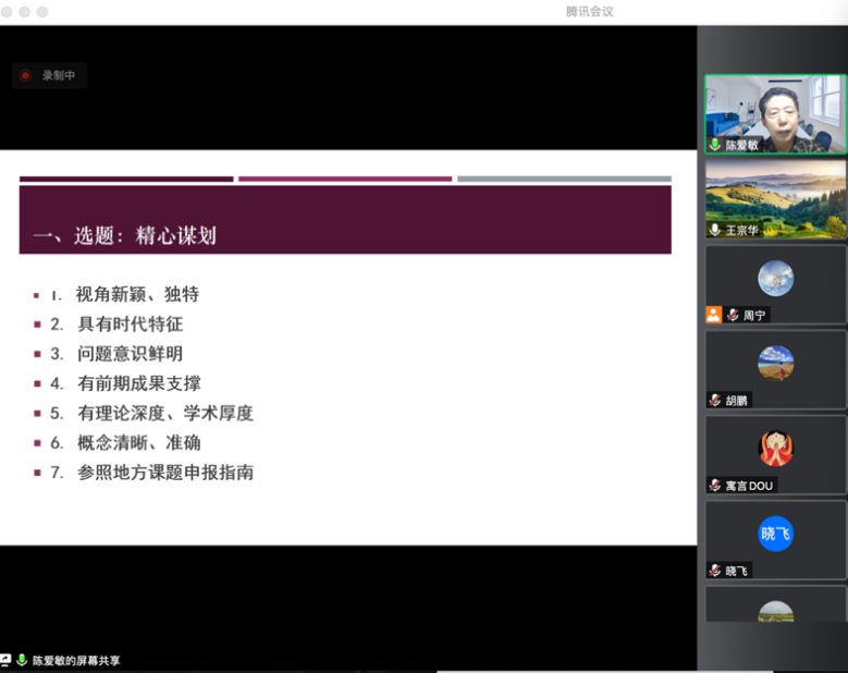 5月10日下午,应社会科学部和外国语学院邀请,南京师范大学陈爱敏教授在线为外国语学院教师做题为“谋与略:如何在社科基金项目申报中胜出”的学术讲座,讲座由外国语学院院长王宗华主持,外国语学院以及国内部分高校教师共计300余人参加。