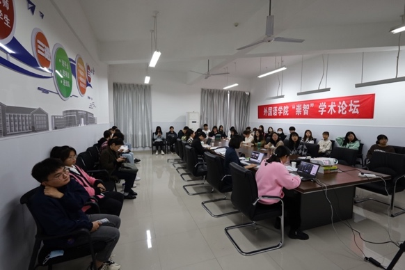 上午主旨发言部分,华中科技大学徐锦芬教授、复旦大学陈靓教授、东北师范大学林忠鹏教授、安徽大学陈婷婷副教授依次发言。徐锦芬教授在题为“高水平学术论文写作关键要素”发言中阐述了高水平学术论文写作的关键要素,帮助写作者创作出高质量学术论文。陈靓教授在题为“国家社科项目申请:选题与论证”的发言中,分享自己成功申报国家社会科学基金项目的经验,介绍国社科项目申请策略和相关重点问题。林忠鹏教授以“日语语言文学及翻译研究与日语课堂教学”为题,介绍了日语语言文学及翻译研究对日语专业学习的重要意义。陈婷婷副教授以“中西交流互鉴——从翻译出发”为题,指出翻译要把具有中国特色的鲜活思想与优秀文化传统传播至全世界,发扬中华优秀文化,坚定文化自信。下午的分论坛分文学、翻译、语言学和教学研究三个会场在崇智楼教室同时进行。外国语学院的十七位教师就各自研究领域展开热烈讨论和研讨。