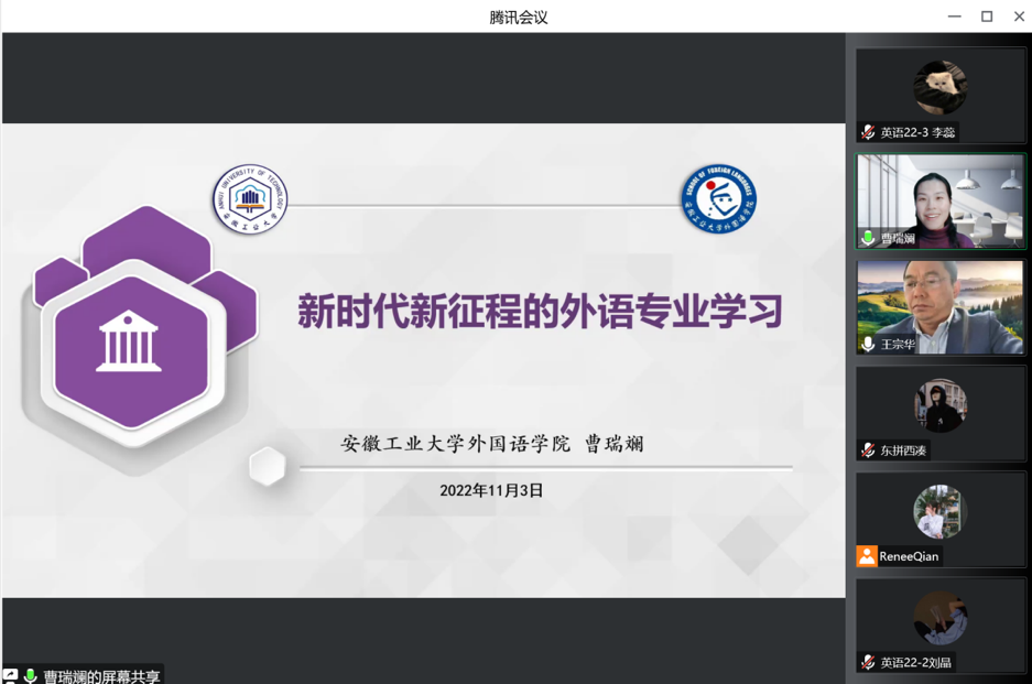 11月2日晚上,应社会科学部和学院邀请,安徽工业大学曹瑞斓教授在线为外国语学院师生做题为“新时代新征程外语专业学习”讲座,讲座由学院院长王宗华主持,学院师生共计200余人参加。