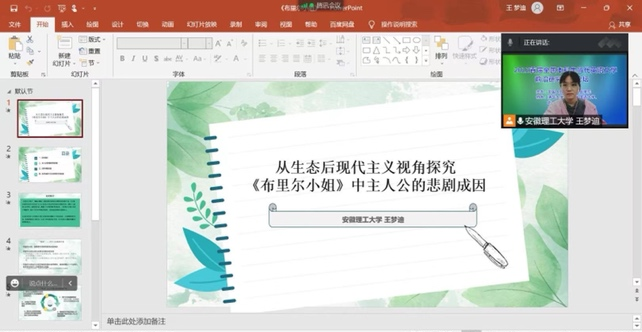 在分论坛会议中,王梦迪以“从生态后现代主义视角探究《布里尔小姐》中主人公的悲剧成因”为题,向与会者分享了自己的论文大纲和行文理念,并结合汇报内容与其他高校学生进行了交流,获得了主持老师的充分肯定和宝贵建议。本次论坛是国内首个面向英语语言文学本科生的大型国内学术会议。通过参会,王梦迪同学与国内各高校同学积极交流学术成果,拓宽学术视野,展现了我院学子良好的精神风貌和学习品质,为未来的文学研究之路迈出了扎实的第一步。