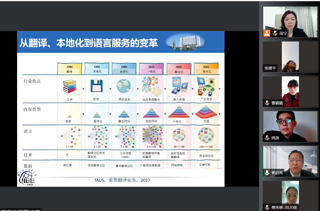 10月28日下午,应科研部和外国语学院邀请,对外经济贸易大学英语学院副教授、硕士研究生导师、国际语言服务与管理研究所副所长崔启亮博士在线为外国语学院师生做了“全球化视角下的翻译、本地化、语言服务纵横谈”的学术报告,讲座由外国语学院副院长周宁主持,外国语学院部分教师以及全体MTI硕士研究生共计70余人参加。