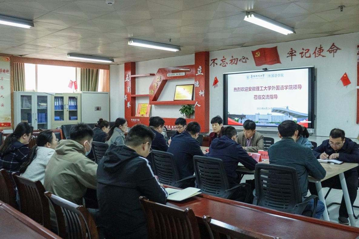 调研组在阜阳师范大学期间,受到该校外国语学院党委书记刘张飞、院长赵从义的欢迎,并参观了阜阳师范大学校史馆和淮河文化馆。双方通过座谈交流、参观学习等形式,围绕党建工作、“三全育人”工作特色与育人成效、本科生就业升学、一流专业建设、实习实践基地建设、语言类特色校园文化活动、辅导员队伍建设等方面交流了经验与做法,并希望两校外国语学院能够建立长期稳定的合作关系,共建共享资源,在硕士研究生招生与联合培养、翻译专业硕士学位点申报等领域开启更高水平、更深层次、更大范围密切合作,促进共同发展。彭晶介绍了学院办学概况、硕士授权点情况、导师团队、研究生招生培养和奖助体系等,为我校翻译专业硕士学位点吸纳优质生源做了积极准备。